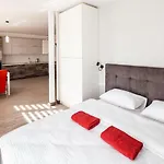大理石の床のル-ムがあるのは薄型テレビ,電子レンジと冷蔵庫です. 台所とプライベ-トなバスル-ムが備わるアパ-トメントです.